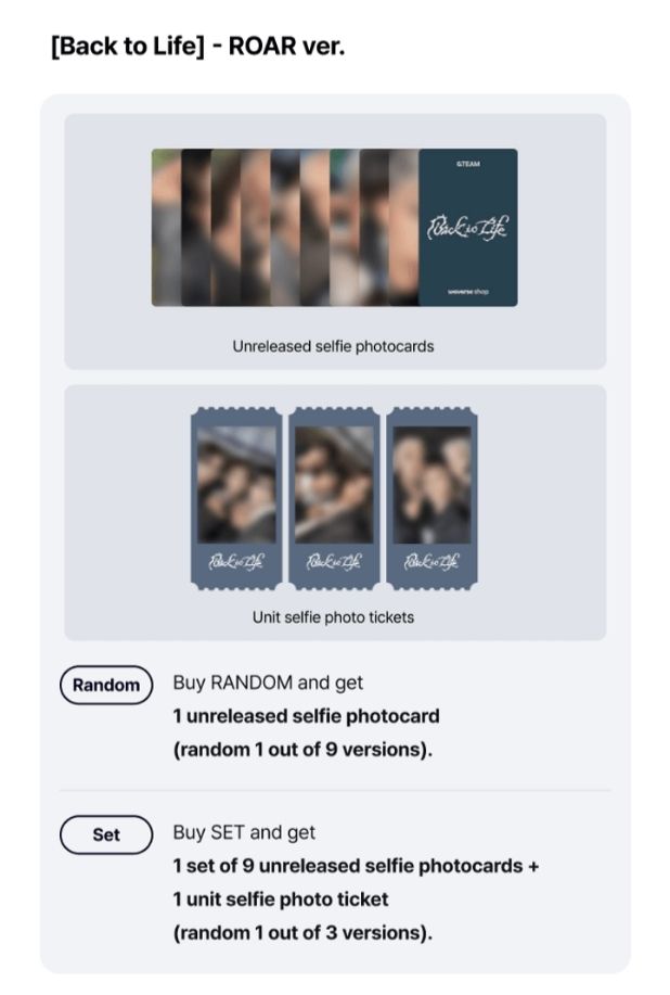 - SET Album Purchase (9 SET): 9ea Selfie Photocard (1set) + 1ea Unit Selfit Photo Ticket (1 random out of 3)