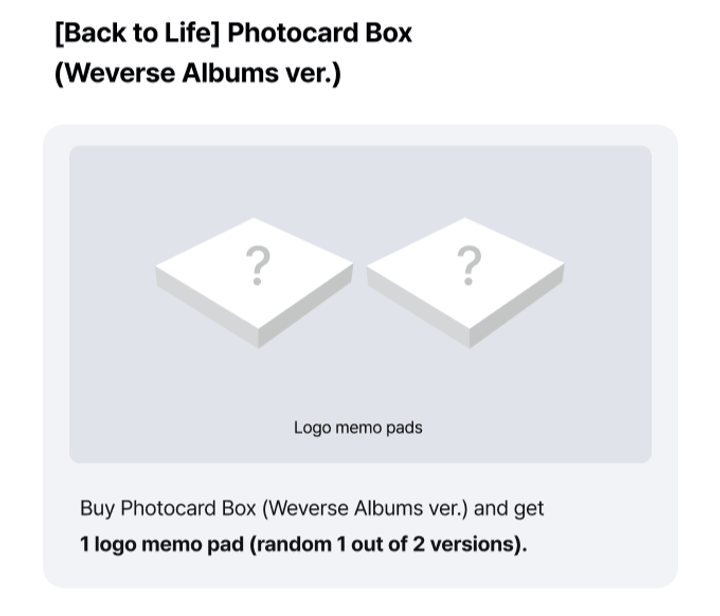 - 1 Album Purchase: 1ea logo memo pad (1 random out of 2)
