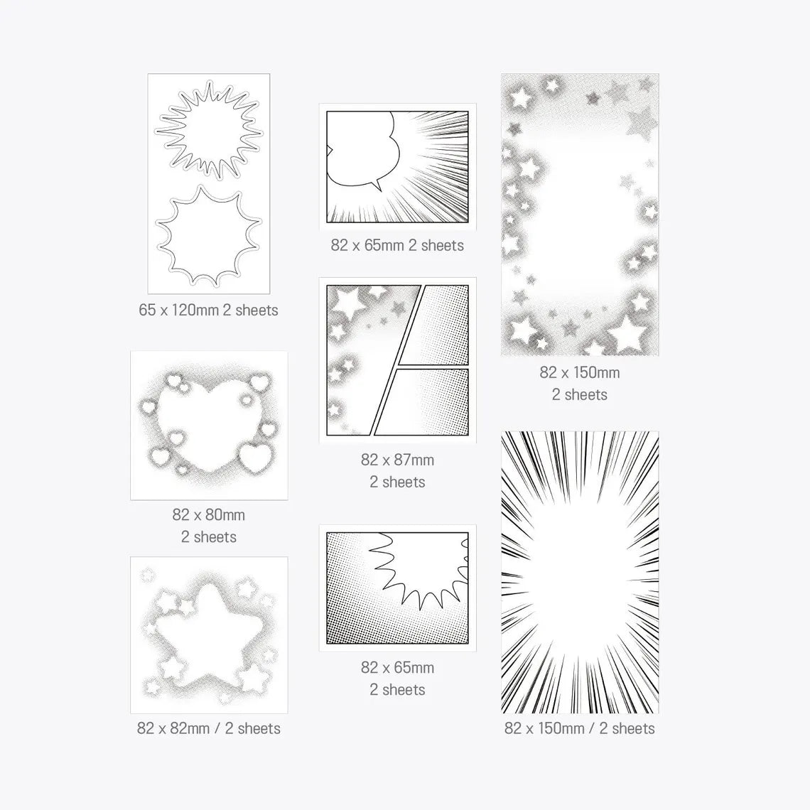 - Sticker Sheets (Various Sizes - 82x150mm, 82x87mm, 82x65mm, 82x82mm, 82x80mm, 65x120mm)